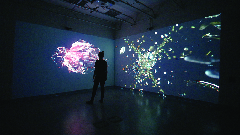 Four animation works that the artist created in the past were updated into an interactive work using 3d animation and visual programming language. The image and sound, which are quiet at the beginning, detects the presence of the viewer and transforms in real time. The lon- ger the presence of the person, the more changes appear. The work aims to create pos- sibly an intimate bond between human and the digital beings.
