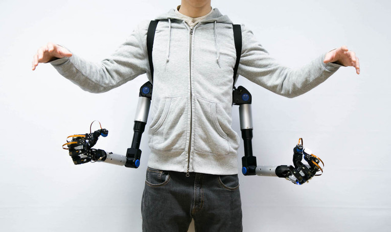 MetaLimbs adds “new arms” that can be freely manipulated by strapping on 2 robotic arms. The robotic arms are worn on the shoulders, and sensors placed on the top of the feet and the knees of both right and left legs track the movements of the legs to move the arms. Moving the toes moves the robot hands, which are equipped with tactile sensors, and the sensations of the robotic hands are fed back to the legs. These robotic arms can provide functions that surpass human physi- cal abilities by replacing the end of the robotic arms with tools such as a soldering iron. As trends in tech- nology transition from prosthetic to human enhancement technology, the question is raised as to how technol- ogy will change human physical sen- sation.
